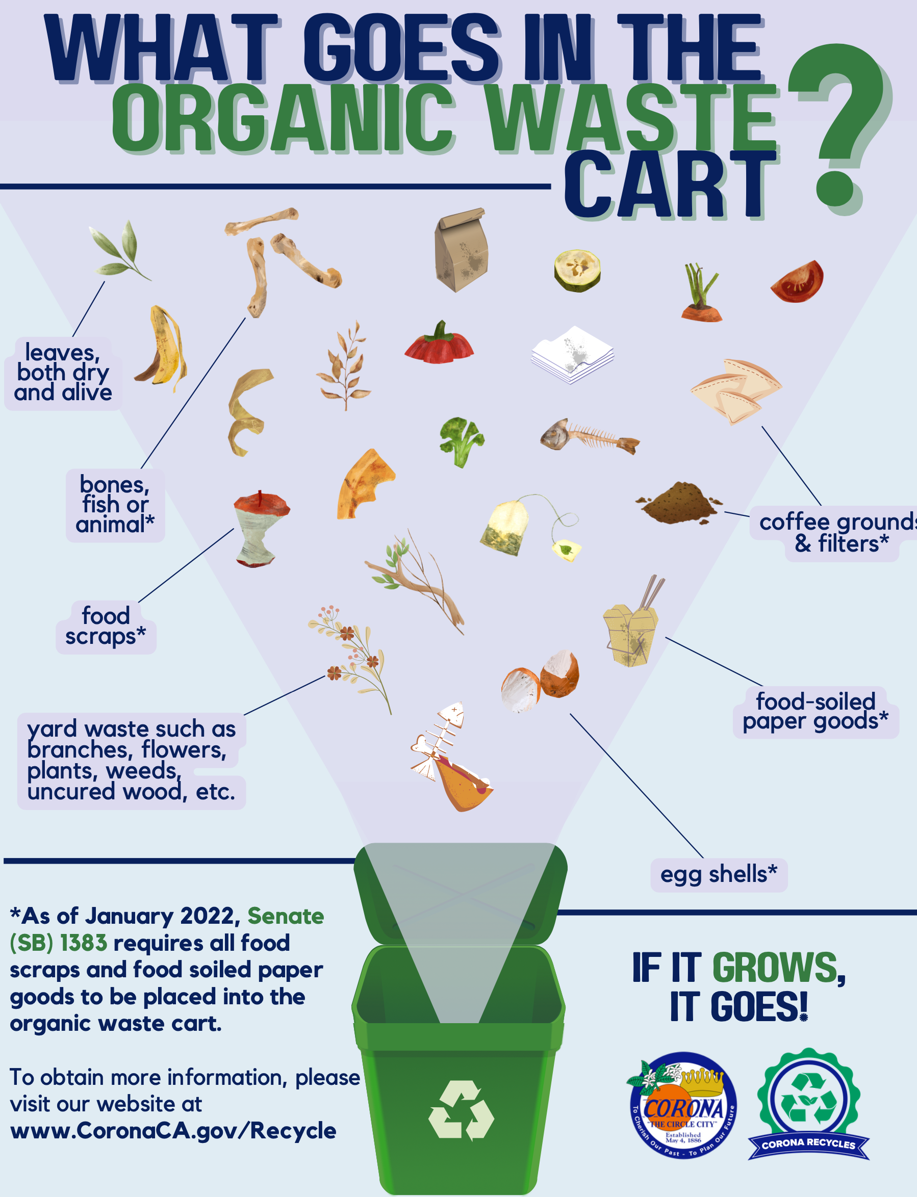*With SB 1383 in place, food scraps and food soiled paper goods can now be organically recycled in your organic waste cart (formerly known as the green waste cart).