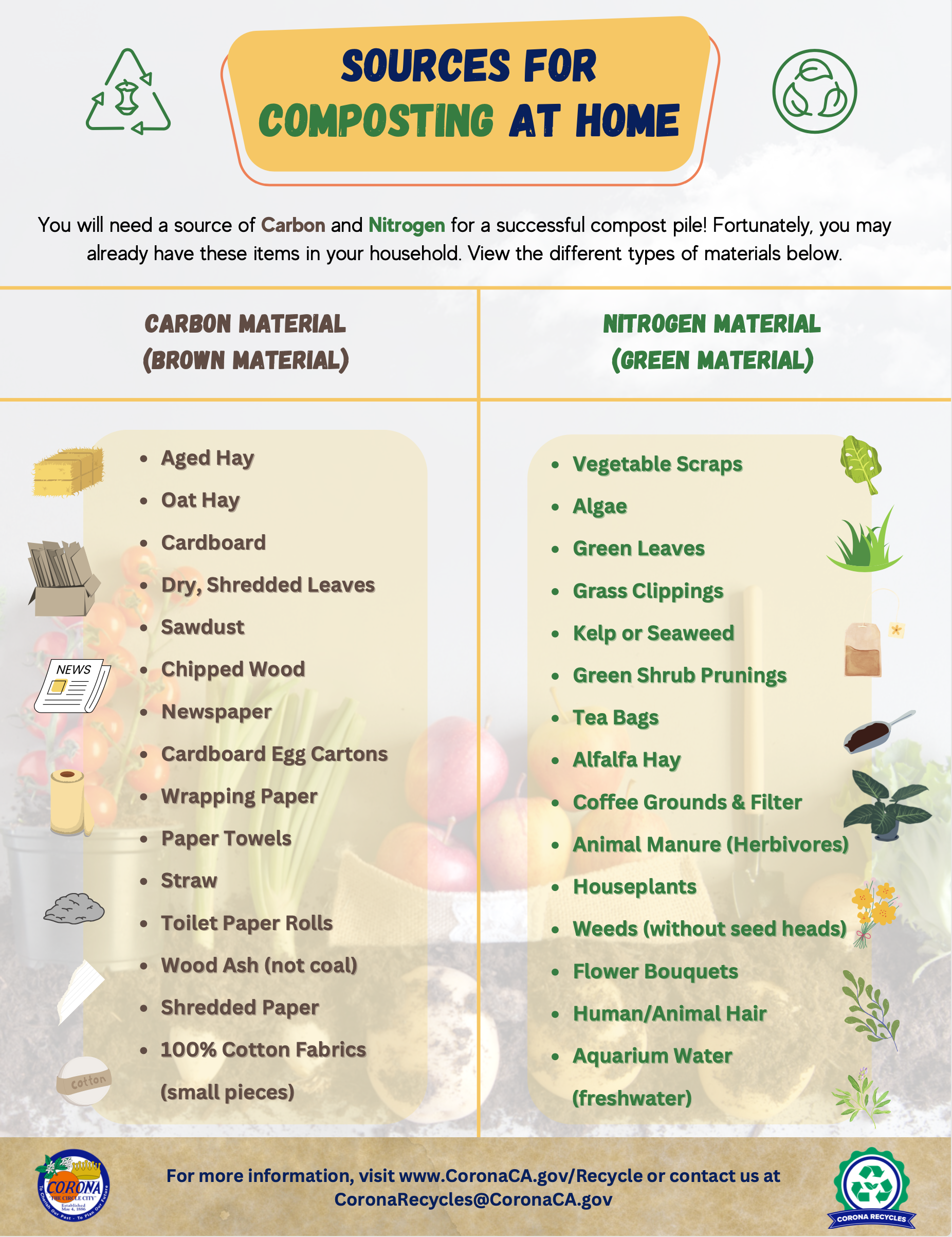 - Make sure to have an even number of browns and greens. Too much of one material can throw off the balance of the pile. Take at potential sources of carbon and nitrogen below!